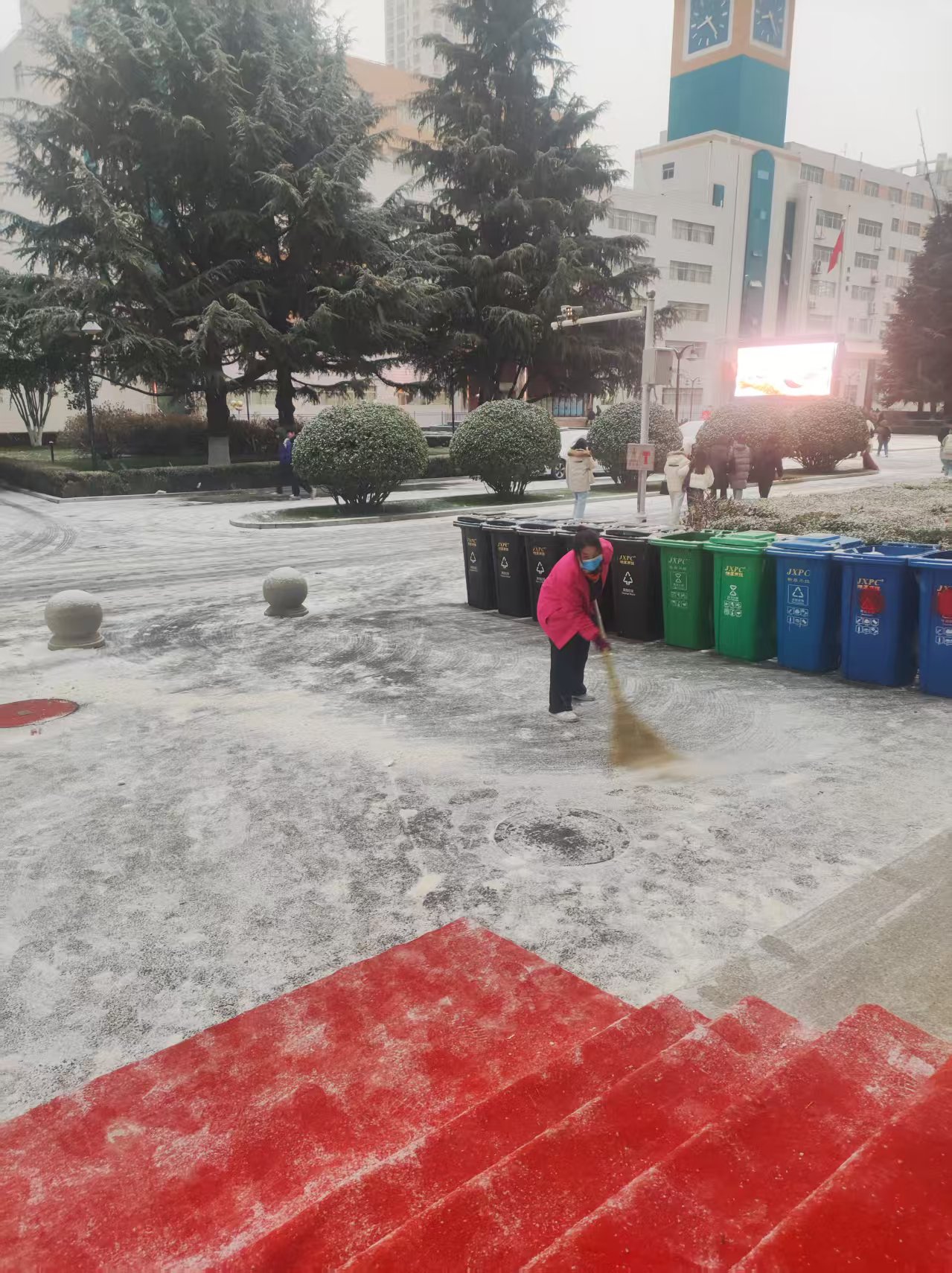 各校区物业服务部工作人员不畏严寒,全力以赴,利用雪铲、扫雪机车等工具连续作业,及时清除路面积雪,在台阶、坡道等易滑处铺设防滑垫,确保师生通行安全。